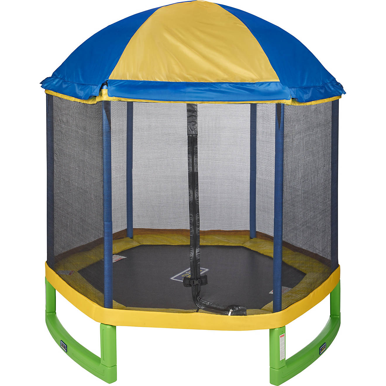 Enjoy fun family bouncing time on the AGame My First 7 ft Trampoline with Tent Top Enclosure. The galvanized frame is rust resistant and utilizes U-shaped legs with a T-weld design for durability, while the soft jump mat is ideal for young jumpers. The zippered polyethylene and mesh netting enclosure provides security and shade.